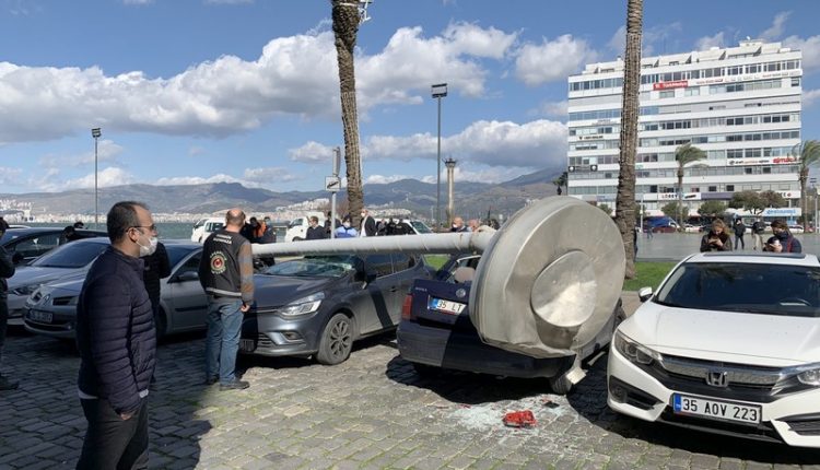 İzmir genelinde şiddetli fırtına etkili oluyor. Konak’taki Cumhuriyet Meydanı’nda da yaklaşık 25 metrelik aydınlatma direği rüzgarın şiddetine dayanamadı.