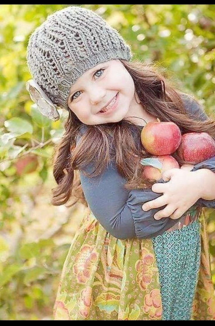 Küçük bir kız elinde iki elma ile oturuyormuş.