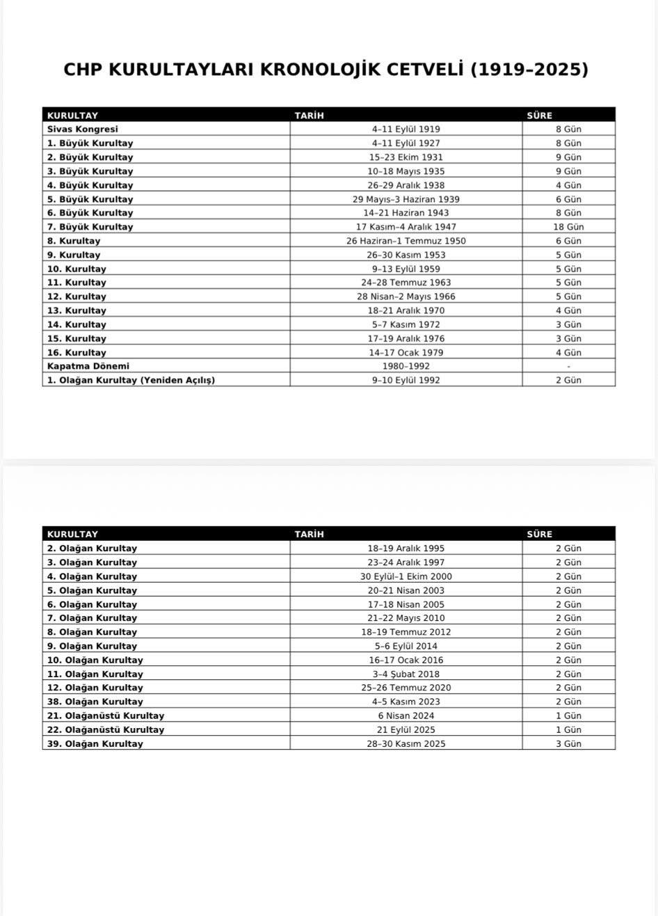 CUMHURİYET HALK PARTİSİ KURULTAY TARİHLERİ VE SÜRELERİ