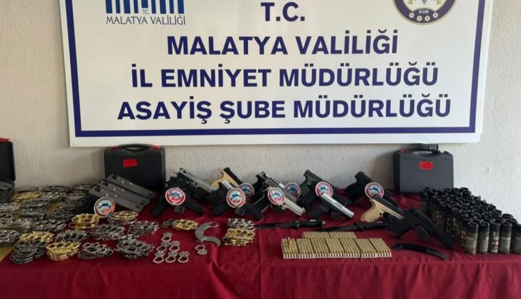 Malatya 1. Sulh Ceza Hakimliğinden alınan arama kararının ardından iş yerinde arama yapan polis ekipleri, 20 kurusıkı tabanca, 500 dolu fişek, 184 muşta ve bıçak ve 50 biber gazı ele geçirdi.