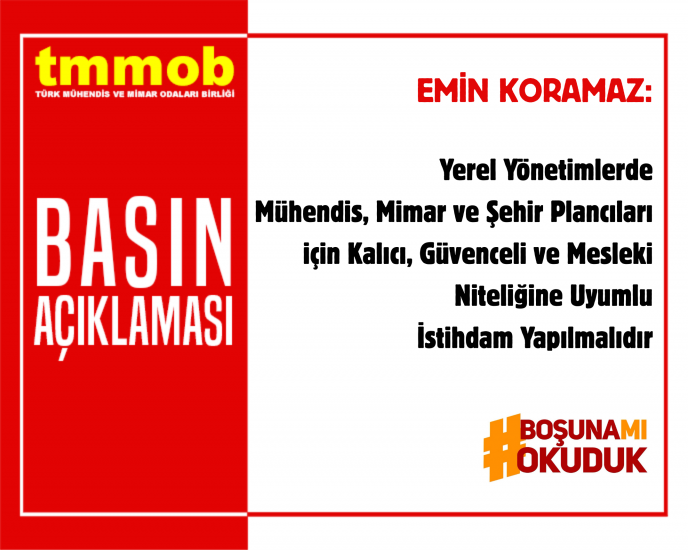 TMMOB Yönetim Kurulu Başkanı Emin Koramaz, 16 Eylül 2025 tarihinde “Yerel Yönetimlerde Mühendis, Mimar ve Şehir Plancıları için Kalıcı, Güvenceli ve Mesleki Niteliğine Uyumlu İstihdam Yapılmalıdır” başlıklı bir basın açıklaması yaptı.